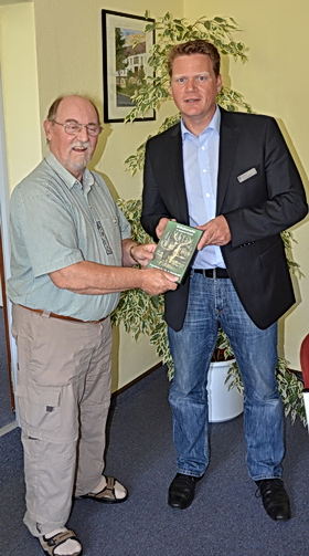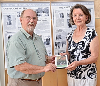Hans-Jürgen Rusczyk übergibt der Vorsitzenden des Vereins "Hilfe für Tschernobylkinder in Brjansk", Dr. Ljuba Schmidt, eine DVD mit Filmaufnahmen aus dem Burger Holz.